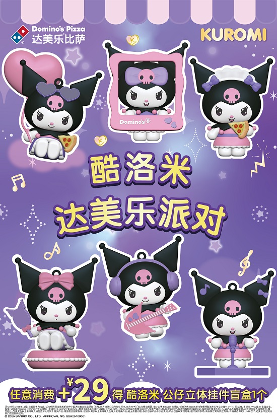 *《酷洛米》达美乐联名活动规则:2025年11月3日起至售完之日,10:00-22:00,活动期间通过达美乐比萨中国大陆官方线上渠道(官网、官方微信公众号及小程序、官方APP)/门店订餐,任意消费加29元即可随餐得《酷洛米》达美乐钥匙扣挂件一个,款式随机,先到先得,售完即止。